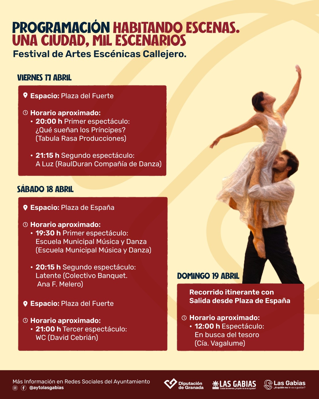 Uno de los grandes ejes de esta programación será el festival de artes escénicas callejero “Habitando Escenas. Una ciudad, mil escenarios”, que se celebrará los días 17, 18 y 19 de abril y que llevará el teatro y la danza a plazas y espacios públicos, convirtiendo la ciudad en un escenario abierto a la ciudadanía. Esta iniciativa se desarrolla en colaboración con la Diputación de Granada y refuerza la apuesta institucional por la cultura como herramienta de dinamización social y cultural.